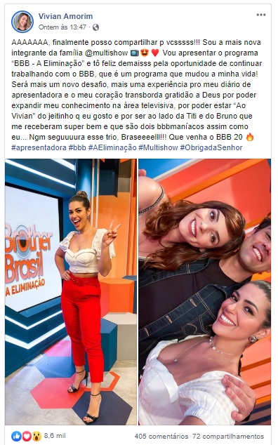 “AAAAAAA, finalmente posso compartilhar p vcsssss!!! Sou a mais nova integrante da família @multishow ??♥️ Vou apresentar o programa “BBB – A Eliminação” e tô feliz demaisss pela oportunidade de continuar trabalhando com o BBB, que é um programa que mudou a minha vida! Será mais um novo desafio, mais uma experiência pro meu diário de apresentadora e o meu coração transborda gratidão a Deus por poder expandir meu conhecimento na área televisiva, por poder estar “Ao Vivian” do jeitinho q eu gosto e por ser ao lado da Titi e do Bruno que me receberam super bem e que são dois bbbmaníacos assim como eu… Ngm seguuuura esse trio, Braseeeelll!!! Que venha o BBB 20″, finalizou.