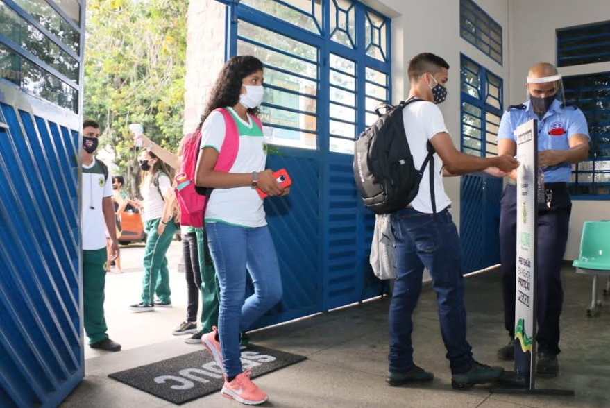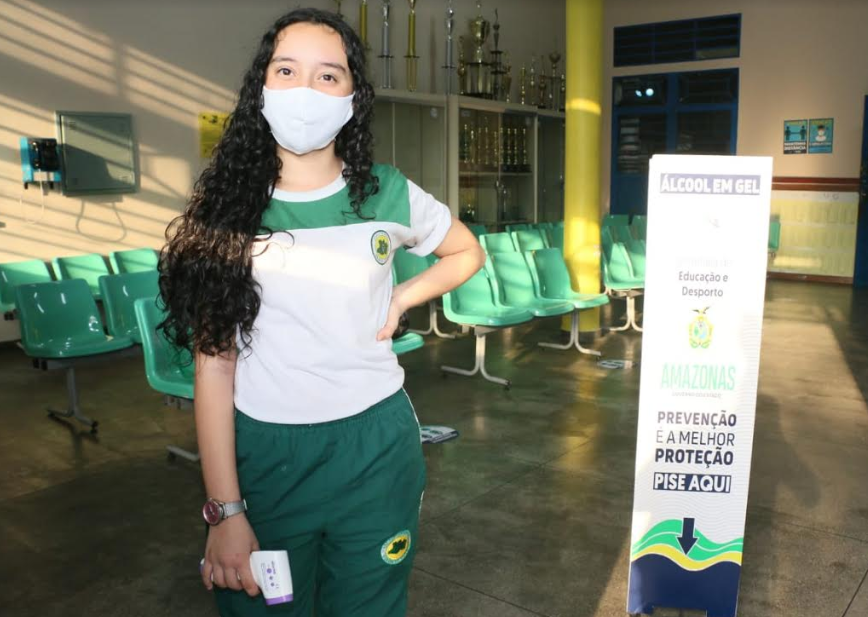 Com mais de 2,6 mil estudantes nos três turnos a Escola Estadual Sólon de Lucena, tem o maior quantitativo de alunos em Manaus. Na porta, uma aluna do Grêmio Estudantil aferia a temperatura dos colegas, enquanto os funcionários conferiam o distanciamento para garantir o seguimento dos protocolos.