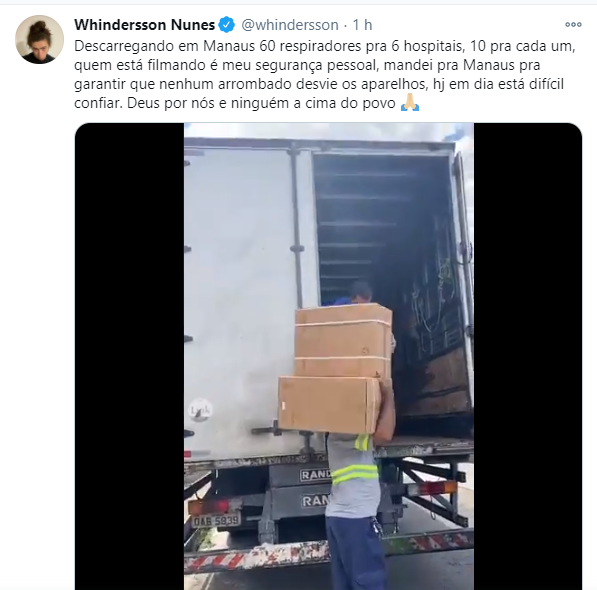 “Descarregando em Manaus 60 respiradores pra 6 hospitais, 10 pra cada um, quem está filmando é meu segurança pessoal, mandei pra Manaus pra garantir que nenhum arrombado desvie os aparelhos, hj em dia está difícil confiar. Deus por nós e ninguém acima do povo”