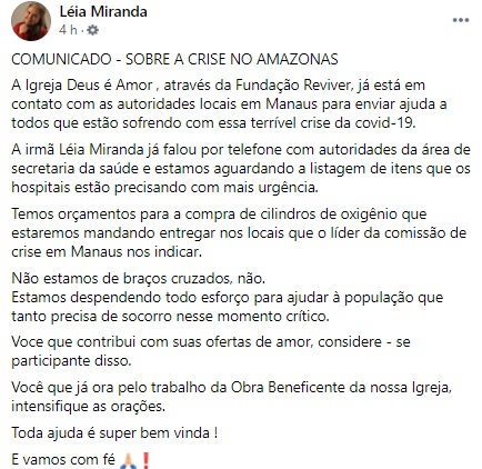 Léia Miranda, uma das líderes da instituição, disse nesta quinta-feira (15/01), que a igreja Deus é Amor está em contato com as autoridades locais em Manaus para enviar ajuda a todos que estão sofrendo com essa terrível crise da Covid-19.
