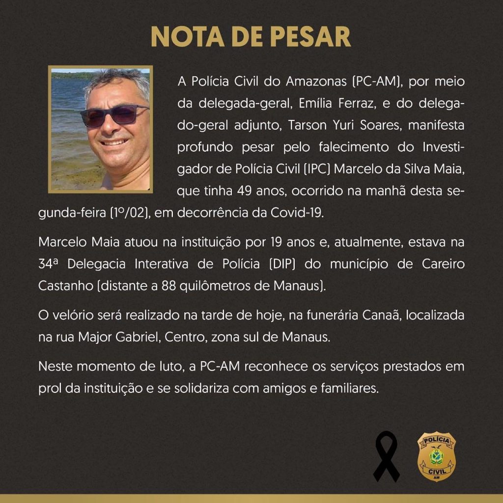 A Polícia Civil do Amazonas informou na tarde desta segunda-feira, o falecimento do Investigador Marcelo da Silva Maia, de 49 anos, vítima da Covid-19.
