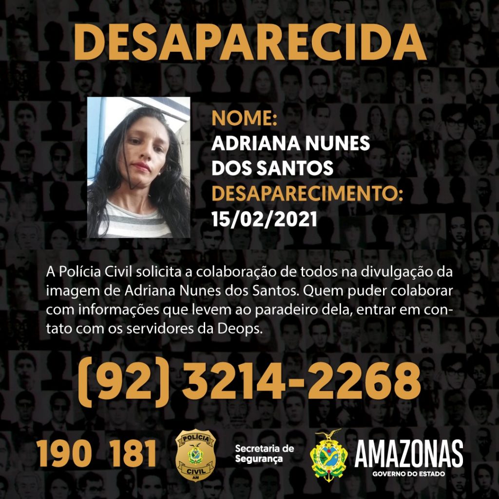 A Polícia Civil do Amazonas (PC-AM), por meio da Delegacia Especializada em Ordem Política e Social (Deops), solicita a colaboração da população para divulgar a imagem de Adriana Nunes dos Santos, 35, que desapareceu no dia 15 de fevereiro deste ano, por volta das 10h, da Rua B, bairro Lago Azul, zona norte da capital.
