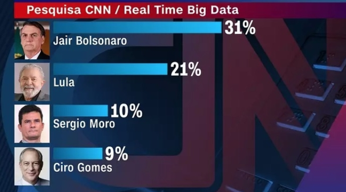 Uma pesquisa divulgada nesta quarta-feira (10) pela CNN mostra que o presidente Jair Bolsonaro larga na frente do ex-presidente Lula na corrida pelo Palácio do Planalto. “Este é o primeiro levantamento após a decisão do ministro Edson Fachin de anular as condenações de Lula na operação Lava Jato, o que o torna elegível para as próximas eleições.”, lembrou a CNN.