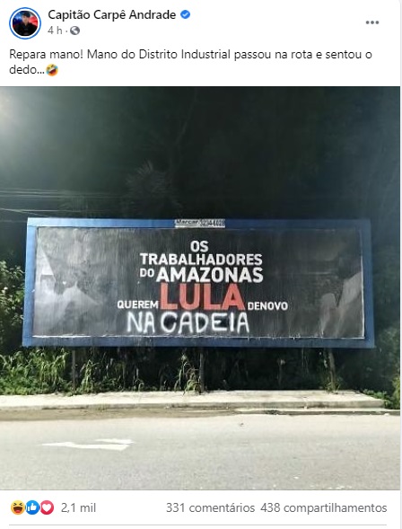 Manaus – Na manhã desta quinta-feira (15), uma placa colocada por apoiadores do ex-Presidente Lula, em uma das vias do Distrito Industrial, foi pichada. Na placa os dizeres “Os trabalhadores do Amazonas querem Lula de novo”. Em seguida, alguém escreveu: “Na cadeia”.