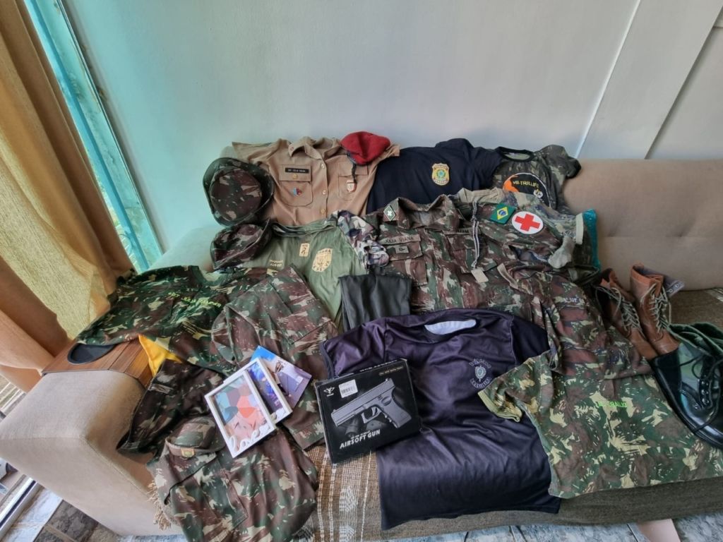 No local da busca, foram encontrados diversos uniformes de diferentes forças de segurança pública, bordados com nomes falsos, broches oficiais, coturnos, um teste de gravidez falso e uma pistola airsoft.